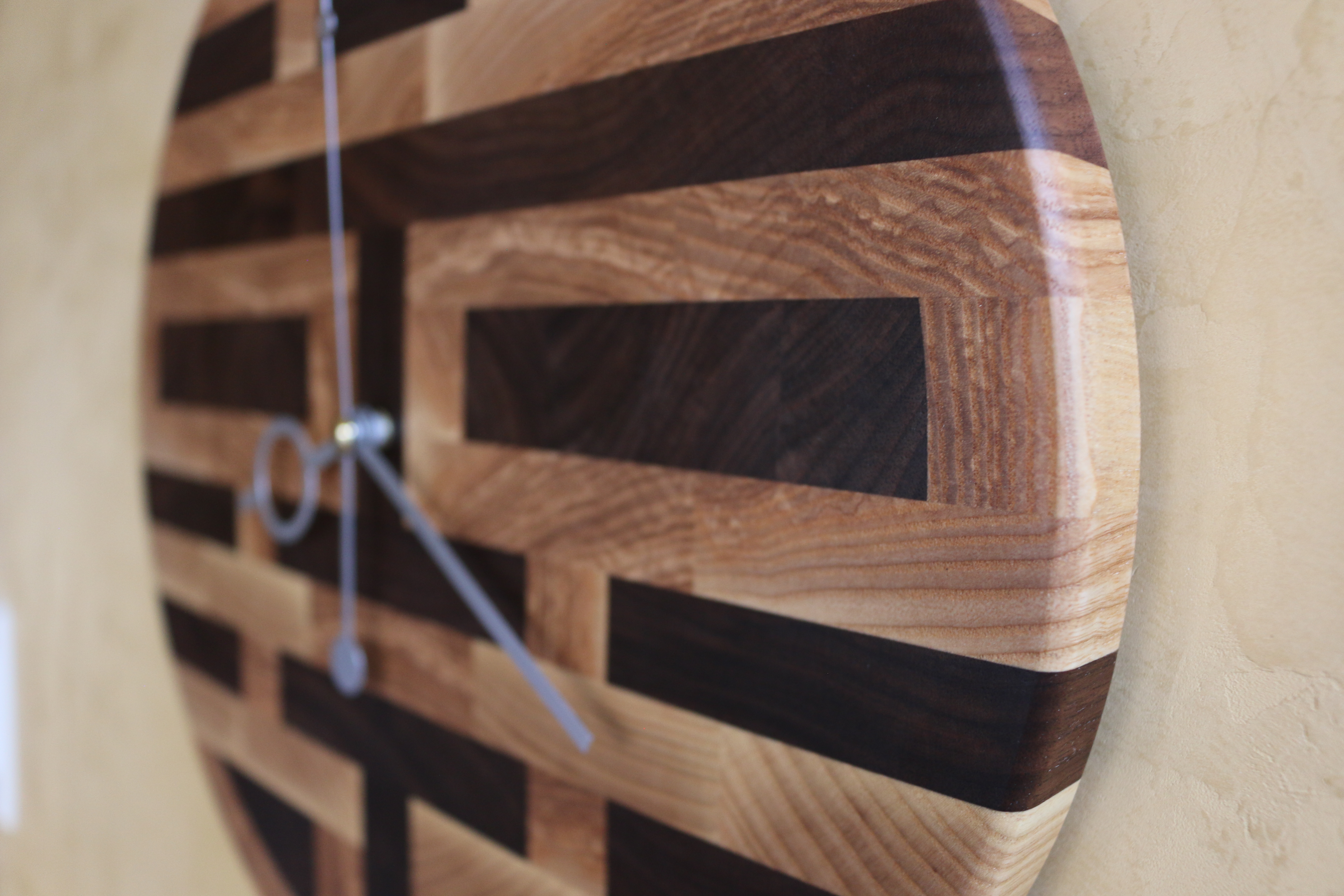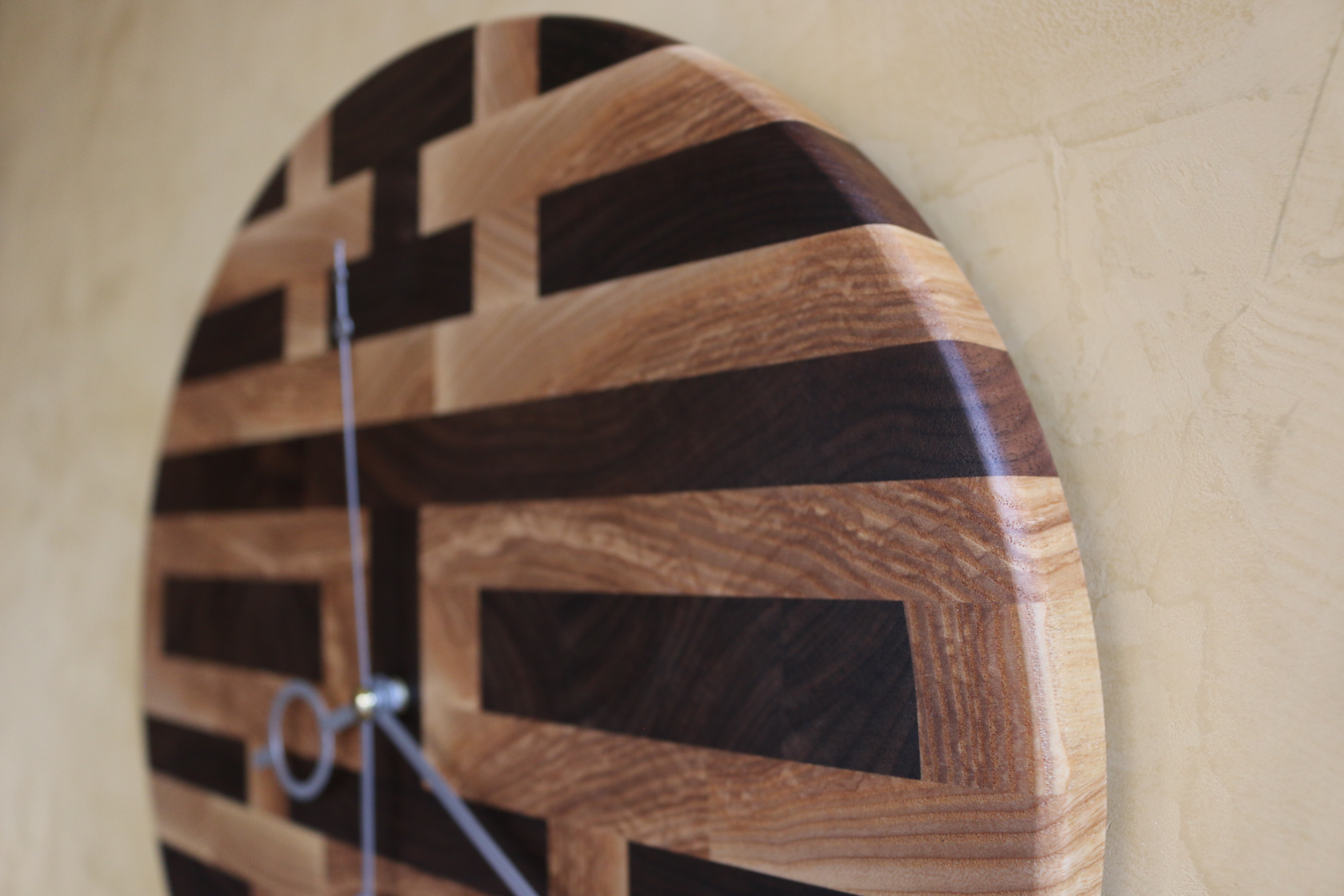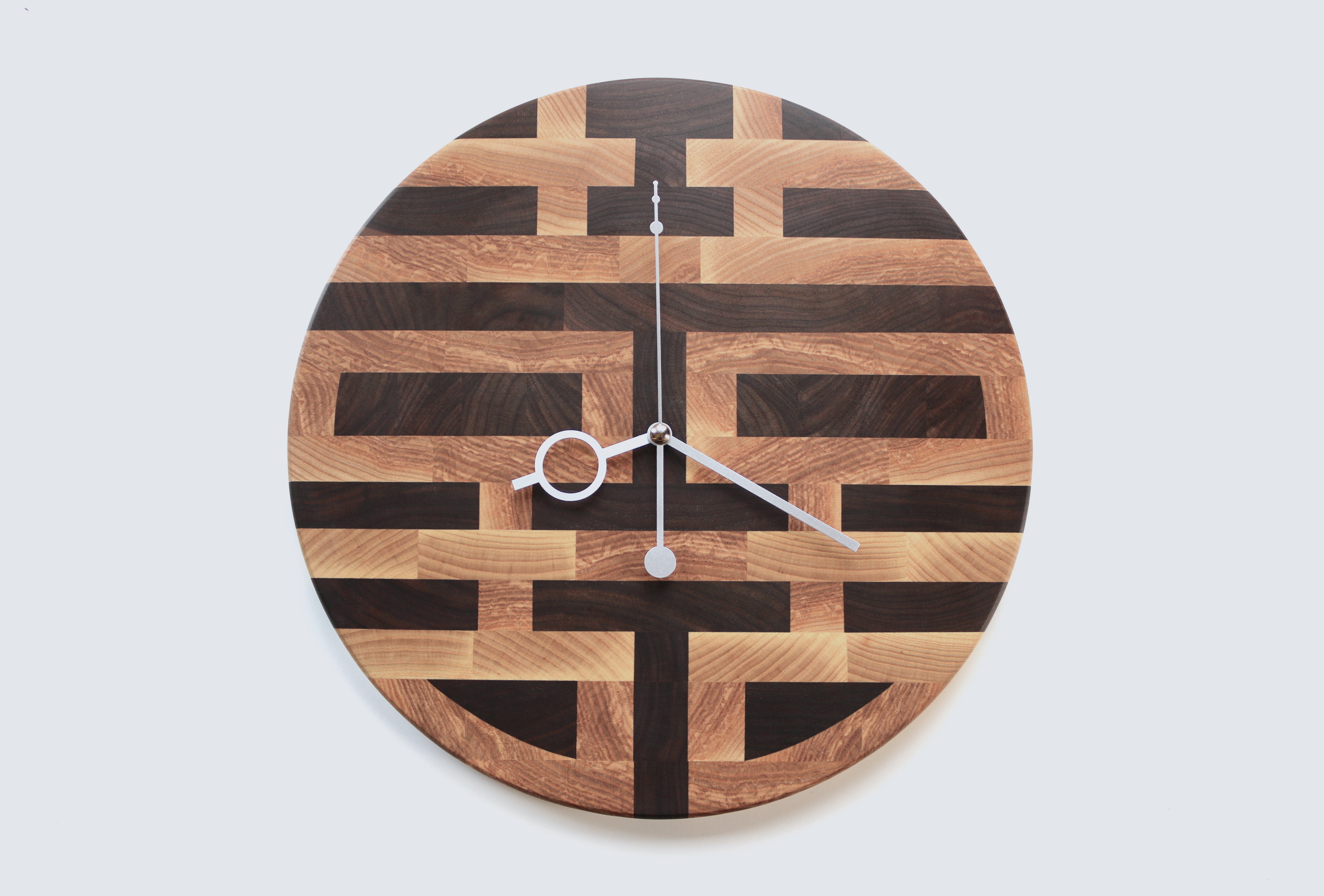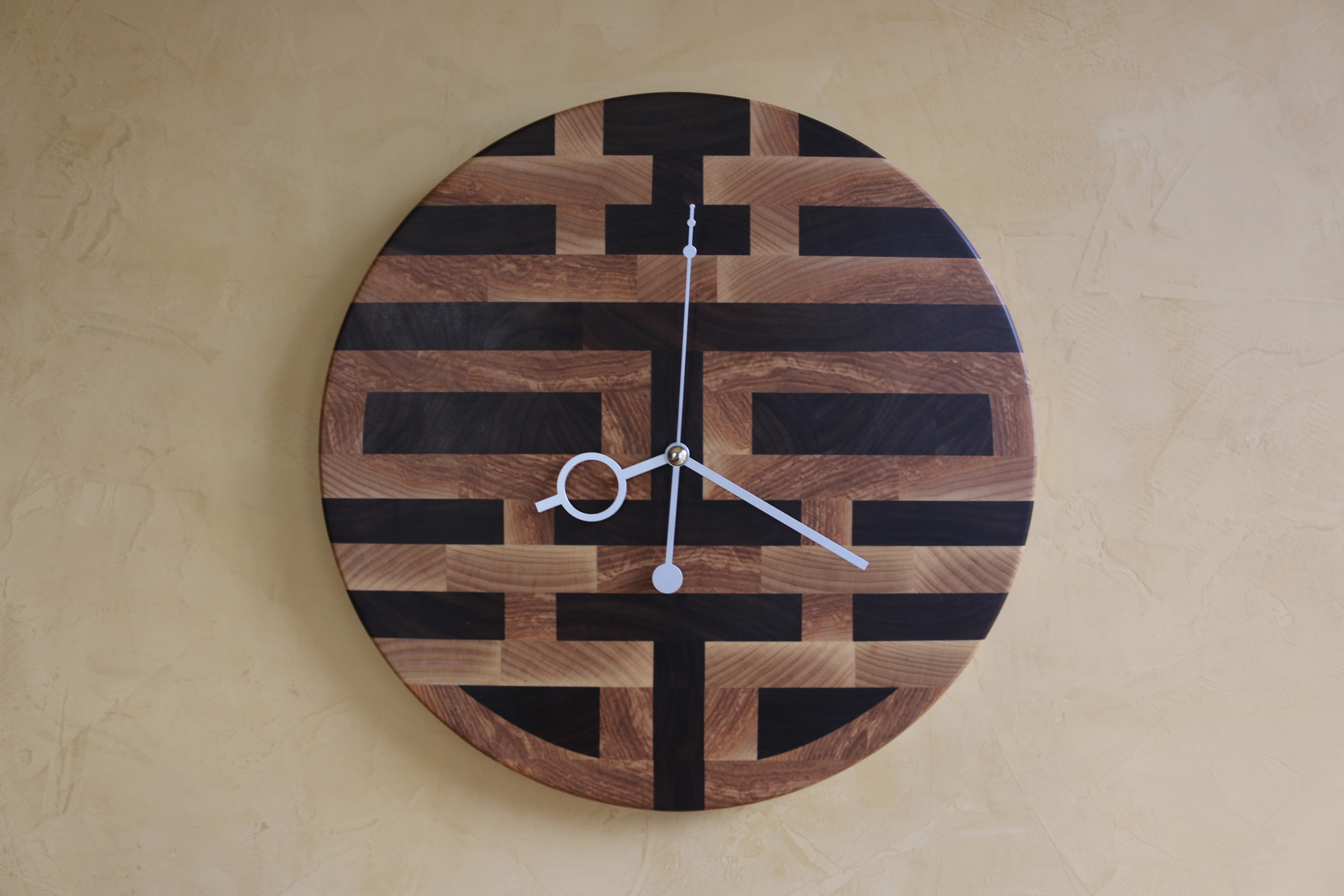 “囍” is the Chinese character for “double happiness”, which is assembled here out of black walnut and white ash wood. The 囍 character is often used as a decorative motif especially in wedding ceremonies to wish boundless joy to a newlywed couple. Consequently, Chinese wedding gifts of all kinds frequently include this motif as well. In contrast, giving a clock as a gift is considered extremely taboo due to the phrase “送鐘/gifting a clock” sharing the same phonetic pronunciation as another phrase, “送終/sending one off” which is a common expression for attending someone’s funeral. As a result, gifting a clock is interpreted almost as a sort of death wish to the receiver.